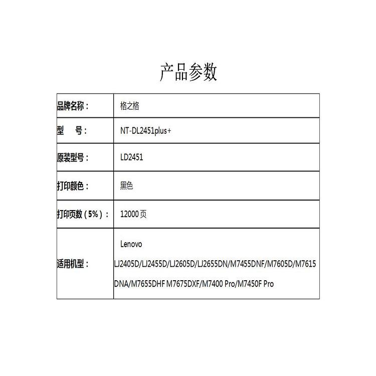 商品标题:格之格(G&G)NT-DL2451PLUS+兼容LD2451硒鼓(鼓组件)黑色单支装(适用机型:Lenovo LJ2405D/LJ2455D/LJ2605D)打印量:12000页(只)