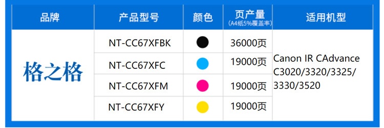 格之格NF-NPG67XFC兼容碳粉盒(支)(适用于佳能Canon IR CAdvance C3020 3320 3325 3330 3520)