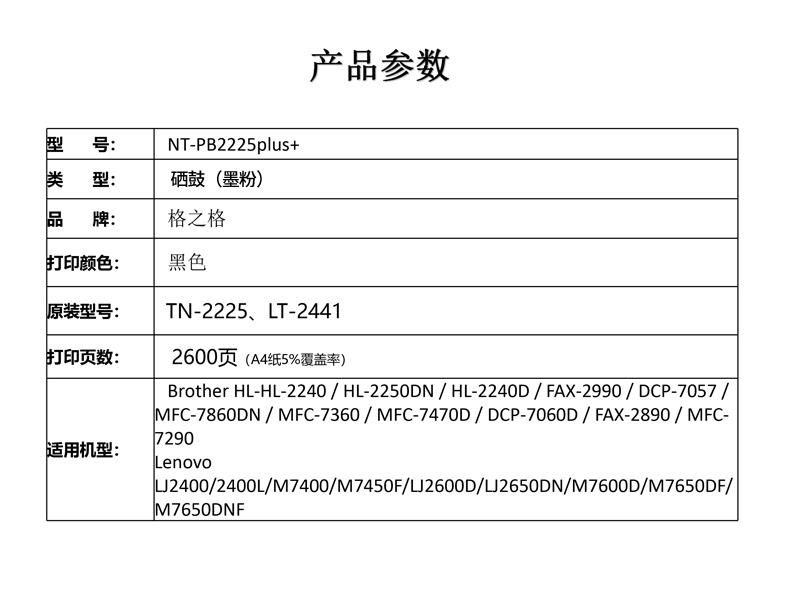 商品名称:格之格tn2225 (适用机型:适用联想m7400硒鼓2400 m7650dnf墨盒7450f 兄弟DCP7360粉盒7057 7060 7470d hl2240 7860墨粉盒)打印量:2600页(只)