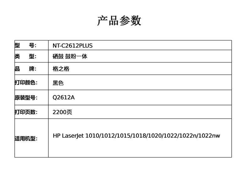 格之格(G&G)NT-C2612PLUS+兼容Q2612A硒鼓(鼓粉一体)黑色单支装(适用机型:HP LaserJet 1010/1012/1015/1018/1020/1022Canon LBP2900/LBP2900+/LBP3000)打印量:2200页(个)