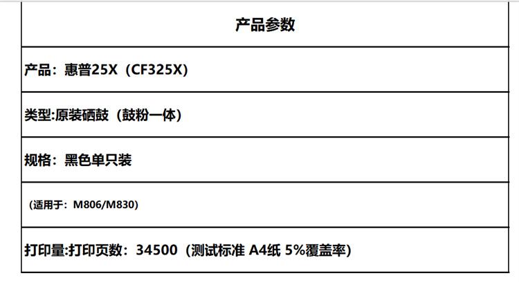 惠普25X(CF325X)原装硒鼓(鼓粉一体)黑色单支装(适用于:M806/M830)打印页数:34500(单位:只)