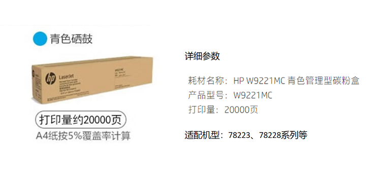 商品标题:惠普W9221MC青色墨粉盒(单位:支)