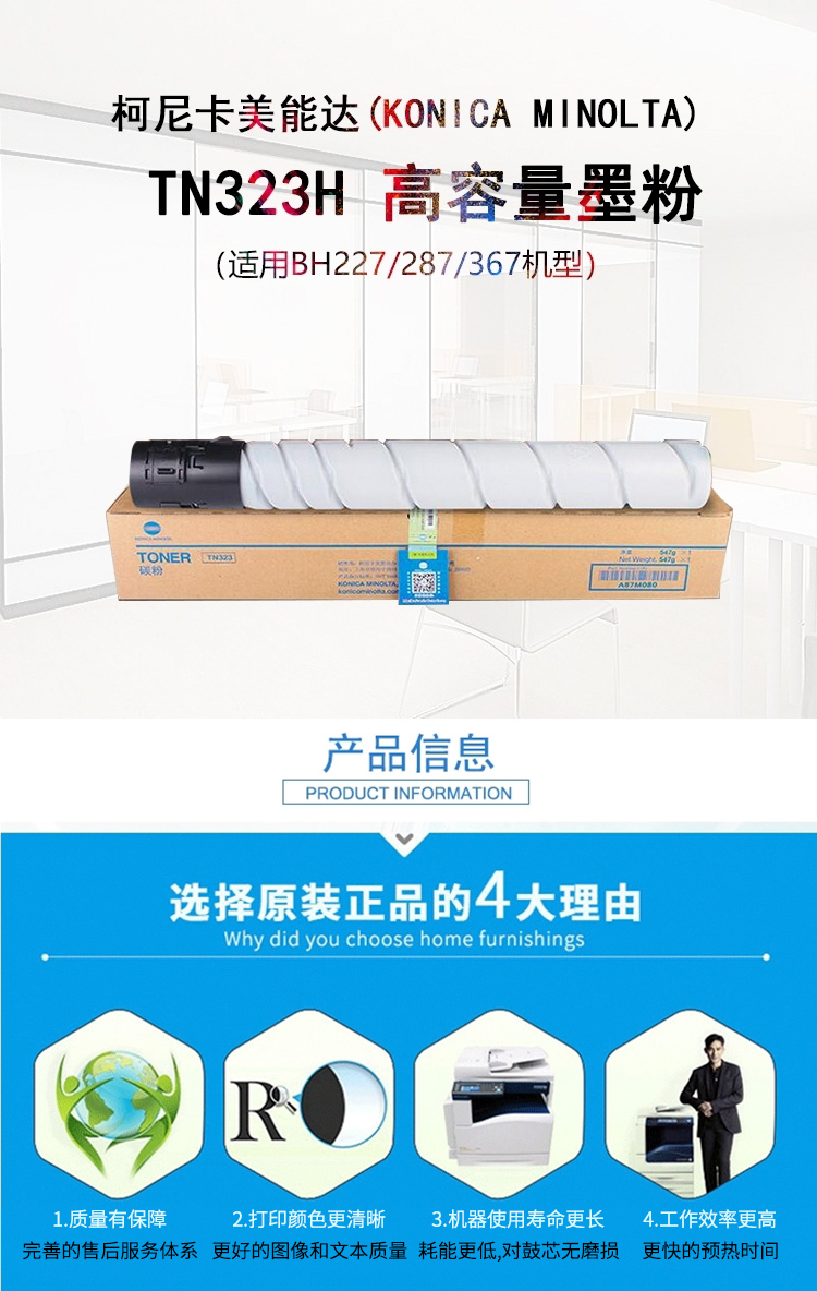 商品标题:柯尼卡美能达 TN323(鼓粉分离)高容原装碳粉黑色单支装(支)(适用BH227/287/367)打印页数:23000墨粉重量:700g