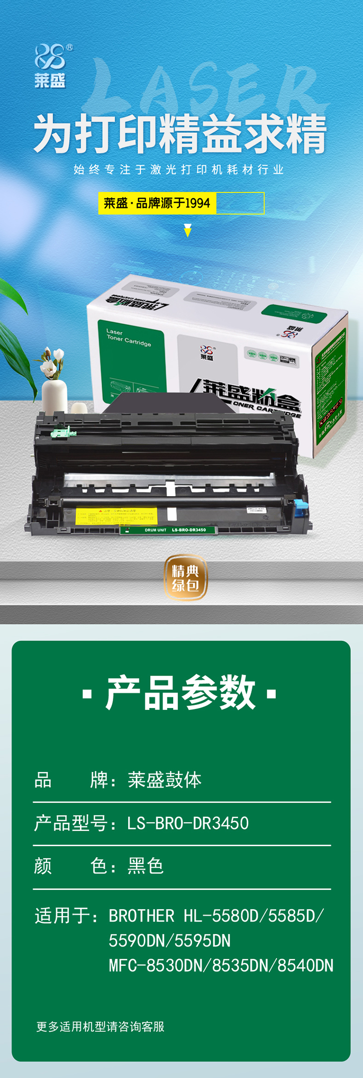 莱盛 LS-BRO-DR3450 鼓体单元(鼓粉分离) 黑色单支装 (适用于BROTHER HL-5580D/5585D/5590DN/5595DN MFC-8530DN/8535DN/8540DN AURORA AD400MNF/AD500PN XEROX DocuPrint P375/P378/P388/M375/M378) 打印页数:30000 (单位:支) 01.CTG.28200