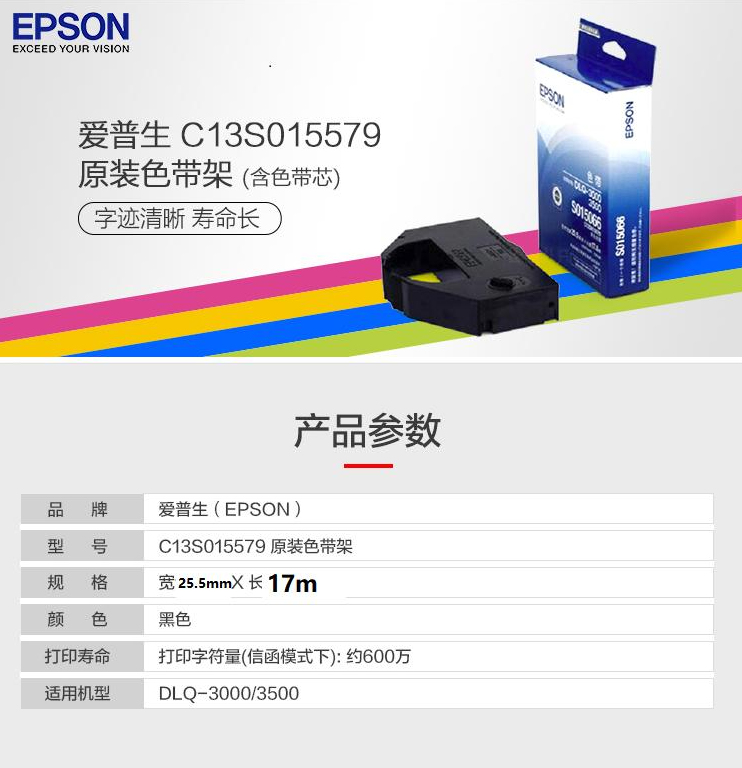爱普生(EPSON)C13S015579 原装色带架含芯 黑色单支装(适用爱普生DLQ-3250KDLQ-3000/3500)打印量:600万字符量 宽25.5mmX长17m(根)