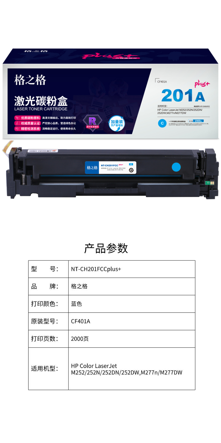 商品标题:格之格(G&G) NT-CH201FCCplus+ 打印量2000页 适用HP Color LaserJet M252/252N/252DN/252DW,M277n/M277DW 碳粉盒 蓝色