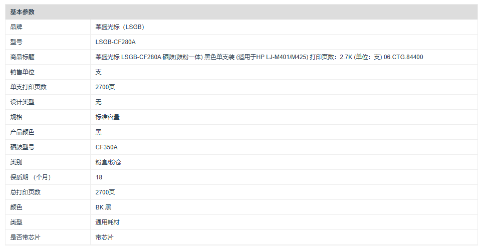 莱盛光标 LSGB-CF280A 硒鼓(鼓粉一体) 黑色单支装 (适用于HP LJ-M401/M425) 打印页数:2.7K 06.CTG.84400(单位:支)