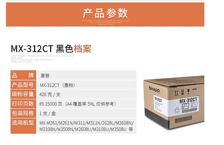 商品标题:夏普(SHARP) MX-312CT 约15000页 适用MX-M261/311/2628L/2608/3108/3508机型 墨粉 黑色
