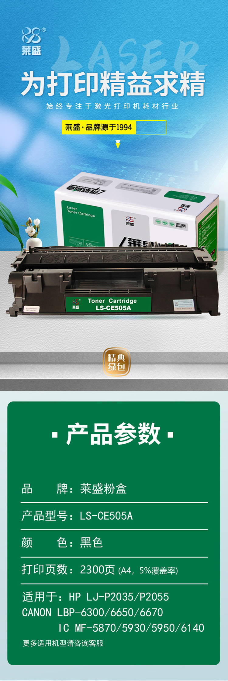 品牌:莱盛 型号:LS-05A 商品标题:莱盛 LS-CE505A 硒鼓(鼓粉一体) 黑色单支装 (适用于HP LJ-P2035/P2055 CANON LBP-6300/6650/6670 IC MF-5870/5930/5950/6140/6160) 打印页数:2300 (单位:支) 01.CTG.14800 销售单位:只