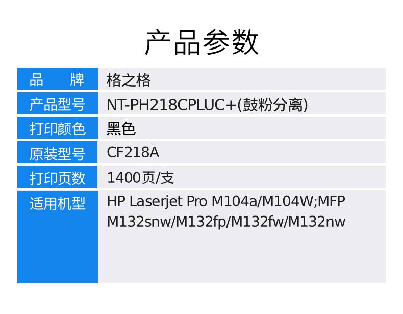 格之格(G&G)NT-PH218CPLUS+兼容CF218A碳粉盒黑色单支装(适用M104a/M104W/M132fw/M132nw)打印量:1400页(个)