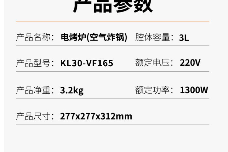 商品标题:九阳KL30-VF165空气炸锅 3L灰色(单位:台)