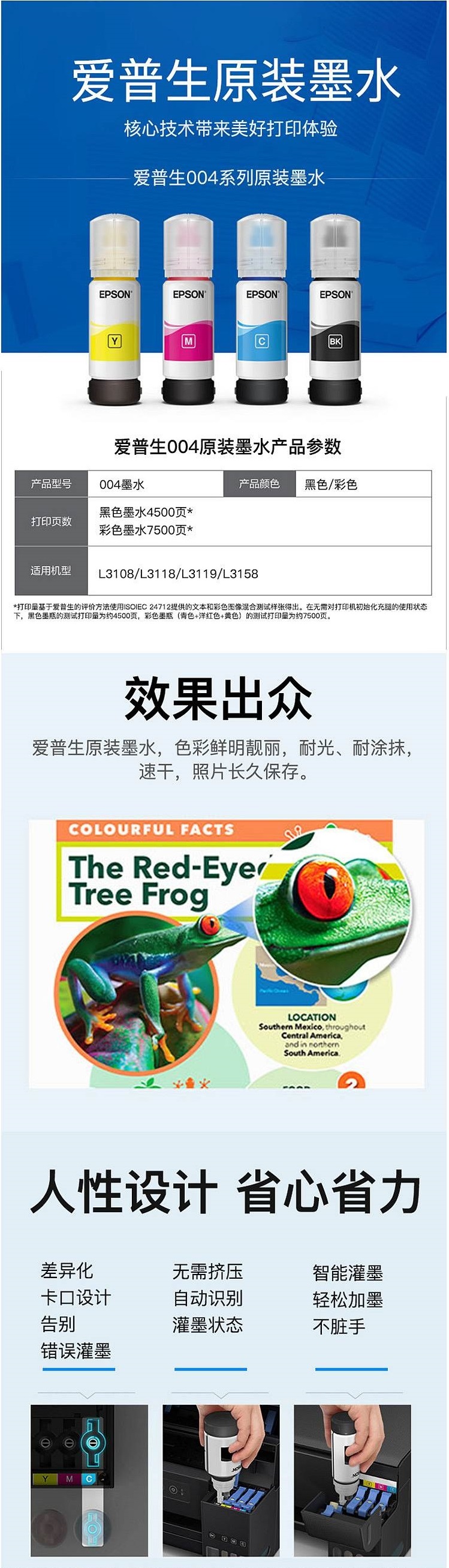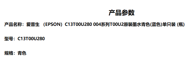 商品标题:爱普生004墨水C13T00U280青色(适用于L3118)(瓶)