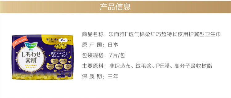商品标题:花王乐而雅 F透气棉柔纤巧超特长夜用护翼型进口卫生巾 40cm*7片 (包)