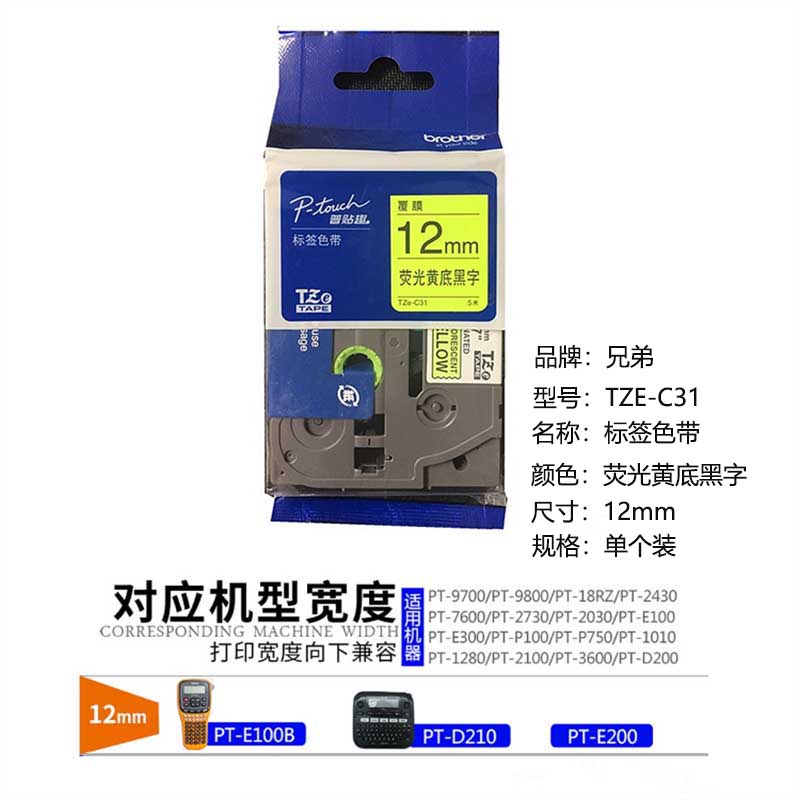 商品标题:兄弟TZE-C31/12mm原装色带(荧光黄底黑字)适用PT-E100B PT-D210 PT-E200(卷)