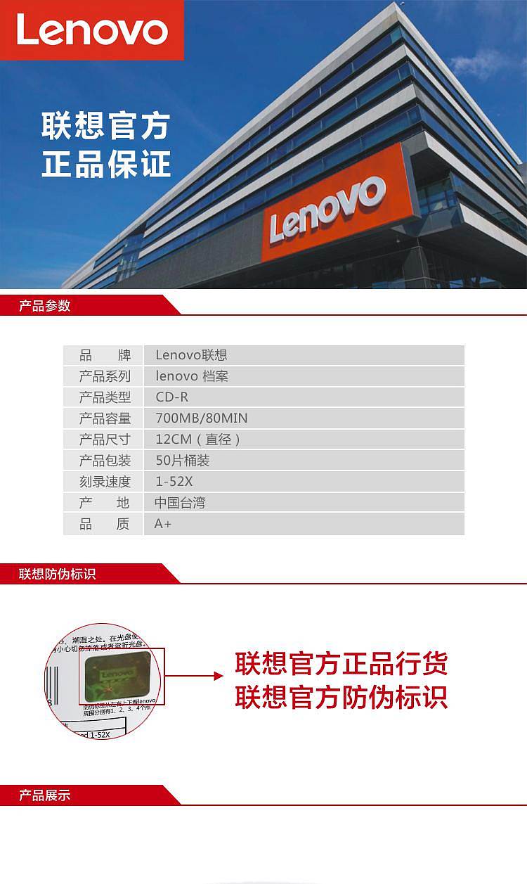 商品标题:联想CD-R光盘/刻录盘52速700MB 直径12cm 台产档案系列桶装50片空白光盘(桶)
