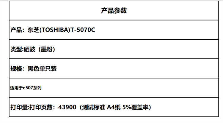 商品标题:东芝 T-5070C 原装硒鼓(墨粉)黑色单支装(适用于e507系列)打印页数:43900墨粉重量:579g(单位:支)