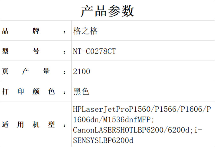 名称:格之格NT-C0278CT兼容CE278A碳粉盒鼓粉一体(单位:支)