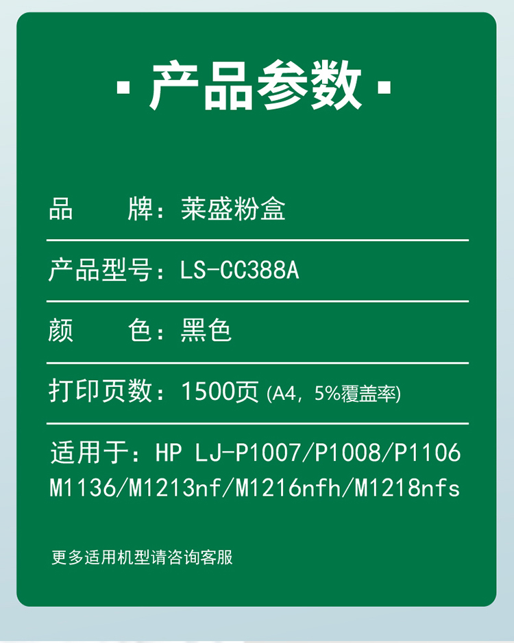 莱盛 LS-CC388A 硒鼓(鼓粉一体) 黑色单支装 (适用于HP LJ-P1007/P1008/P1106/P1108/M202 M1136/M1213nf/M1216nfh/M1218nfs/M126/M128/M226) 打印页数:1500 (单位:支) 01.CTG.13600