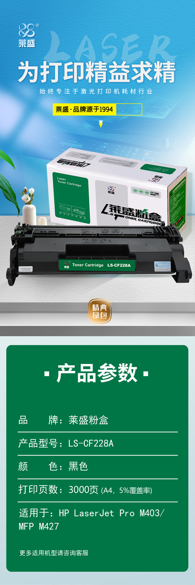 名称:莱盛 LS-CF228A 硒鼓(鼓粉一体) 黑色单支装 (适用于HP LaserJet Pro M403/MFP M427) 打印页数:3000 (单位:支) 01.CTG.25700