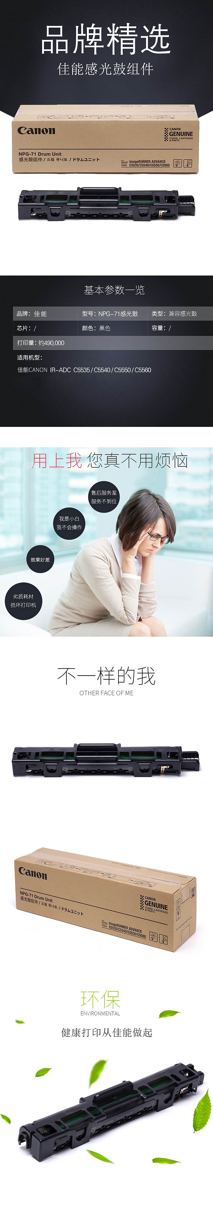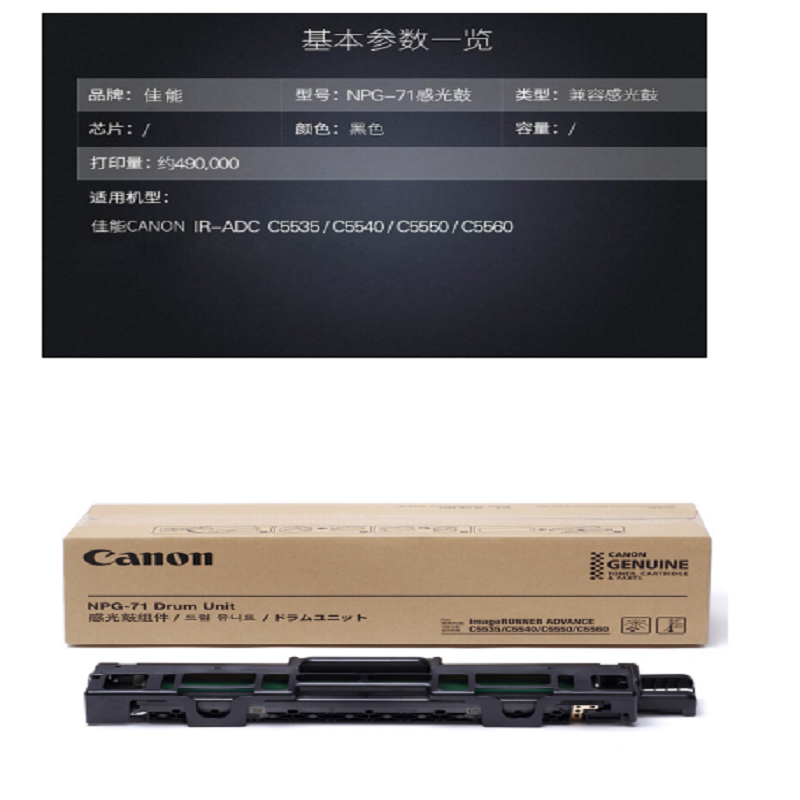 商品标题:佳能 NPG-71 原装感光鼓组件(四鼓通用)适用机型佳能CANON IR-ADC C5535/C5540/C5550/C5560 打印页数:490000(单位:个)
