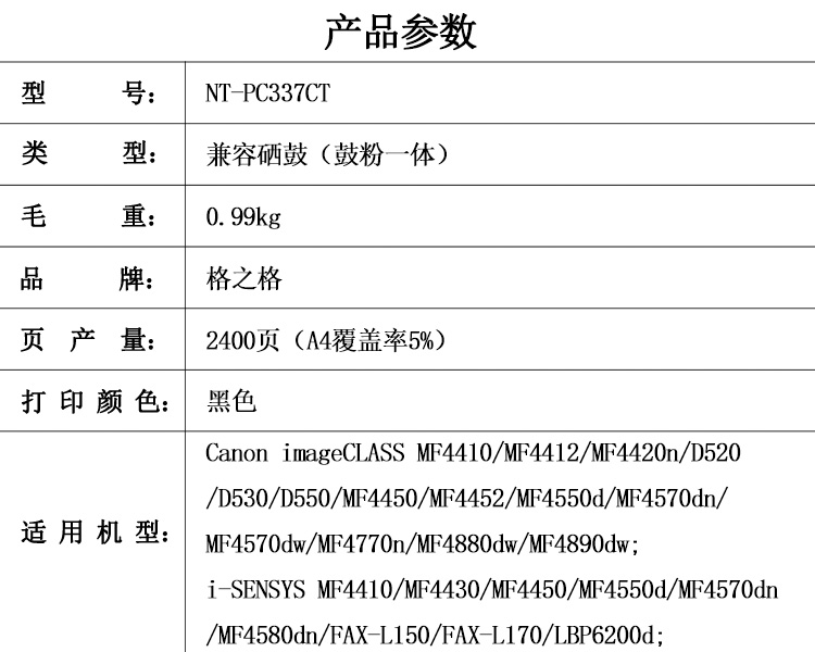 名称:格之格NT-PC337CT兼容CC337C碳粉盒(个)