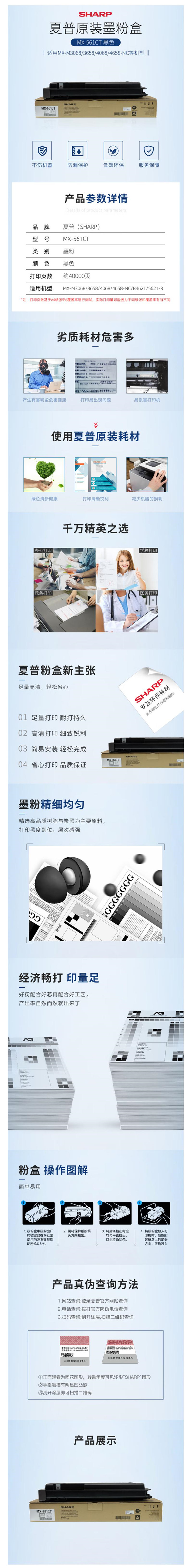商品标题:夏普MX-561CT碳粉黑色 (适用机型:MX-M3608/5608/3658/4608/4658-NC/B4621/5621-R)(单位:支)