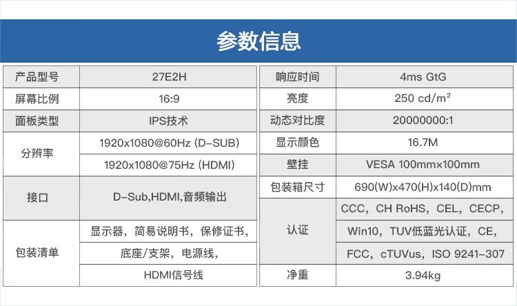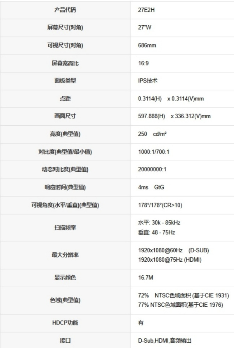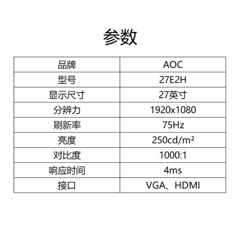 商品标题:冠捷(AOC)电脑显示器 27E2H全高清 IPS窄边框 HDMI高清可壁挂 TUV爱眼低蓝光不闪屏 27英寸(单位:台)