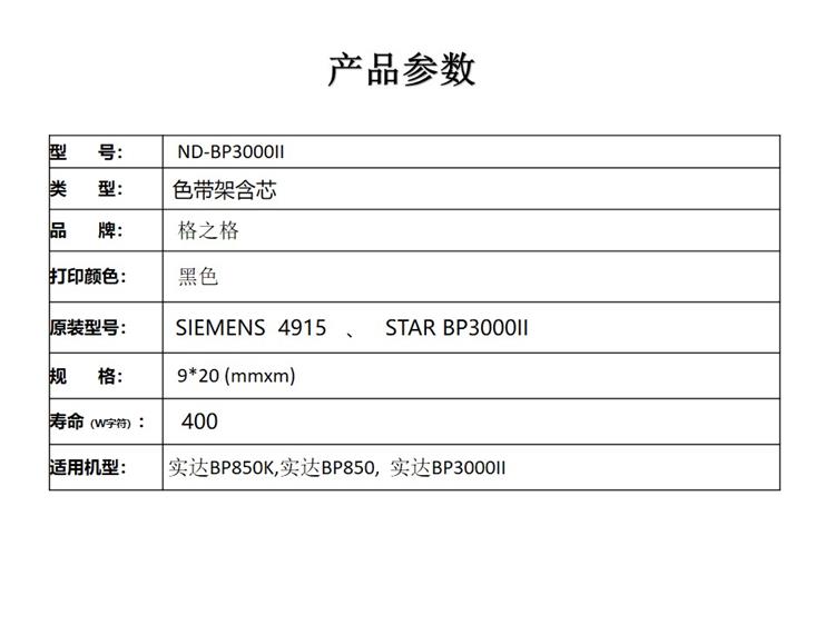 商品标题:格之格(G&G)ND-BP3000II兼容BP3000II色带(色带架含芯)黑色单支装(适用机型:实达BP850K,实达BP850, 实达BP3000II)打印量:9*22(mmxm)(个)