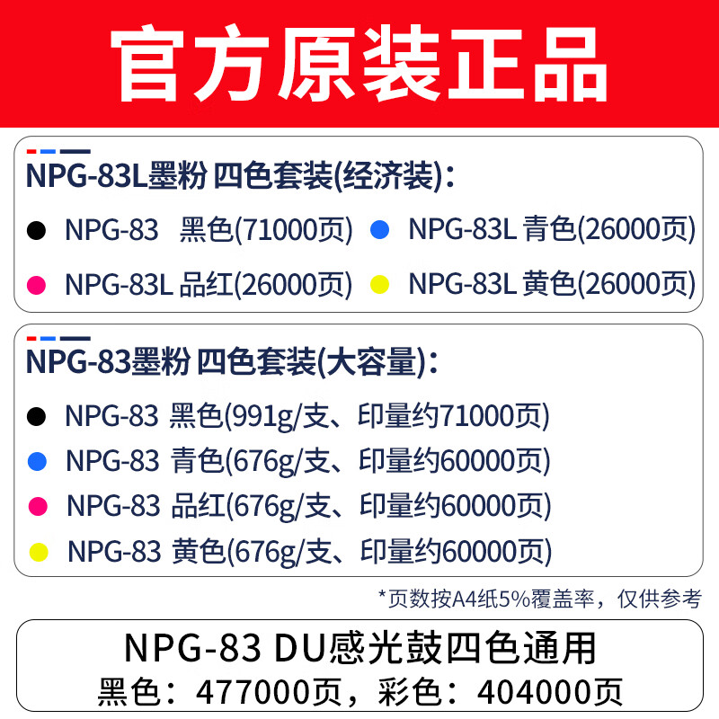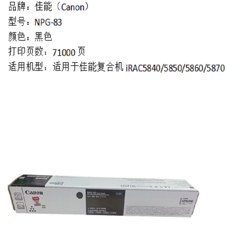 商品标题:佳能NPG-83 TONER BK黑色标准容量墨粉(适用于佳能复合机iRAC5840/5850/5860/5870)(71000页)(支)