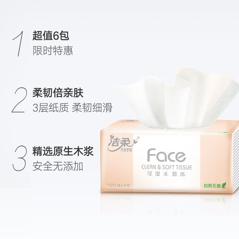 商品标题:洁柔PR078-06无香软抽195*133mm3层120抽6包(单位:提)新老包装随机发货