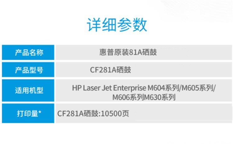 商品标题:惠普(HP)81A (CF281A)原装硒鼓(黑)(单位:只)(适用于:M604/605/606/630)(打印量10500页)
