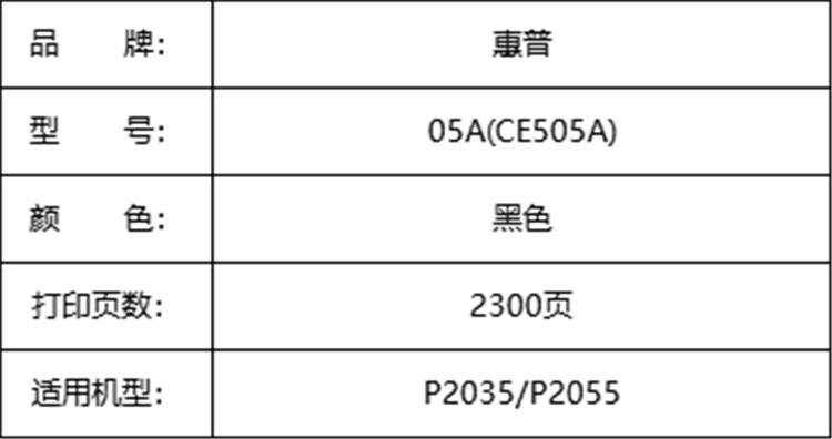 商品标题:惠普05A(CE505A)原装硒鼓(鼓粉一体)黑色单支装适用于P2035/P2055打印页数:2300页