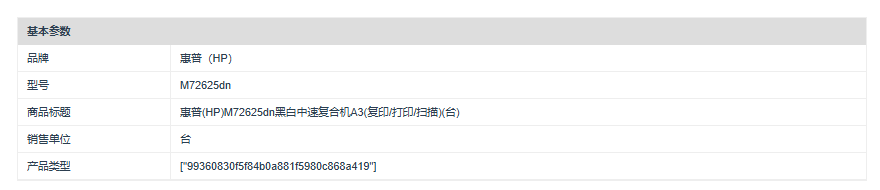 </1i>品牌:惠普(HP)</1i>型号:M72625dn</1i>商品标题:惠普(HP)M72625dn黑白中速复合机A3(复印/打印/扫描)(含输稿器、双纸盒)(台)</1i>销售单位:台</1i>质保期:一年</1i>包装清单:机器、电源线、随机耗材、用户指南