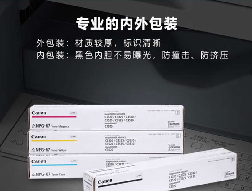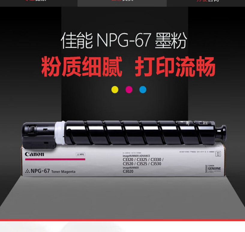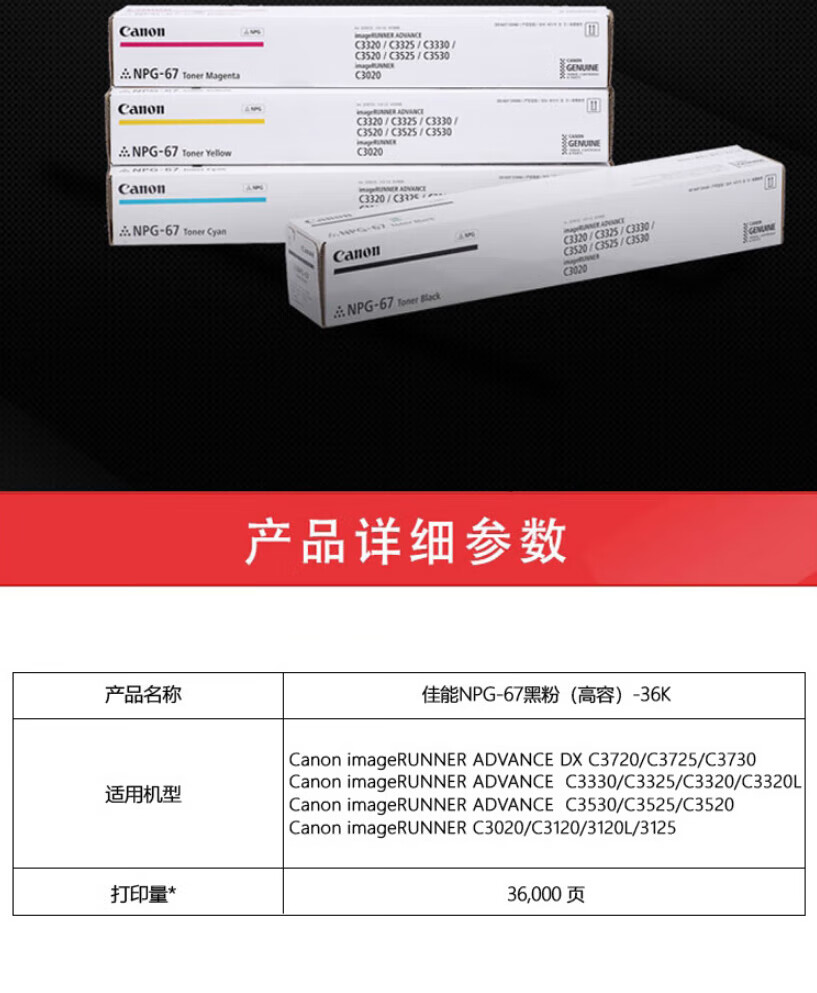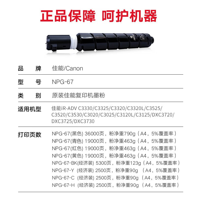 商品标题:佳能 NPG-67-TonerBlack 标准容量 原装墨粉 36000页(适用iR-ADVC3330/iR-ADVC3325/iR-ADVC3320/iR-ADVC3320L)36000页(支)