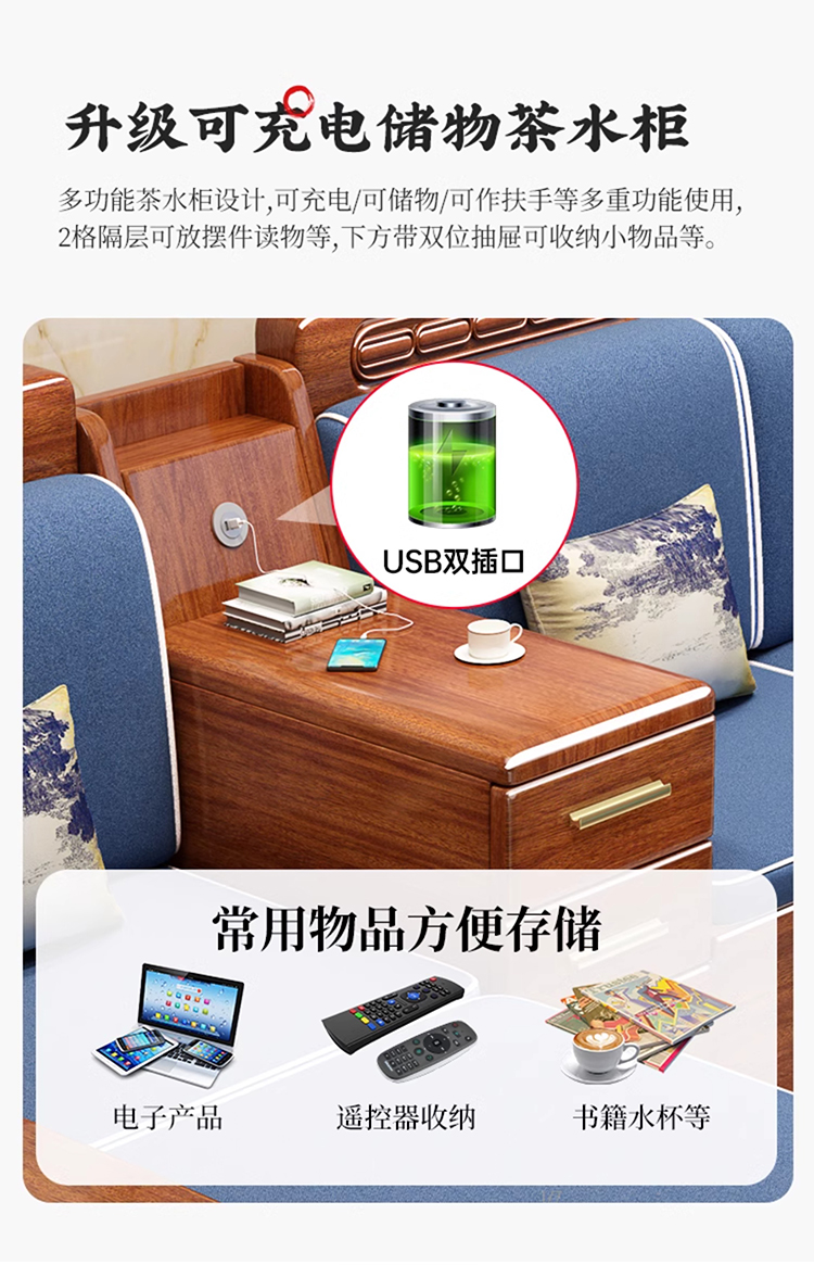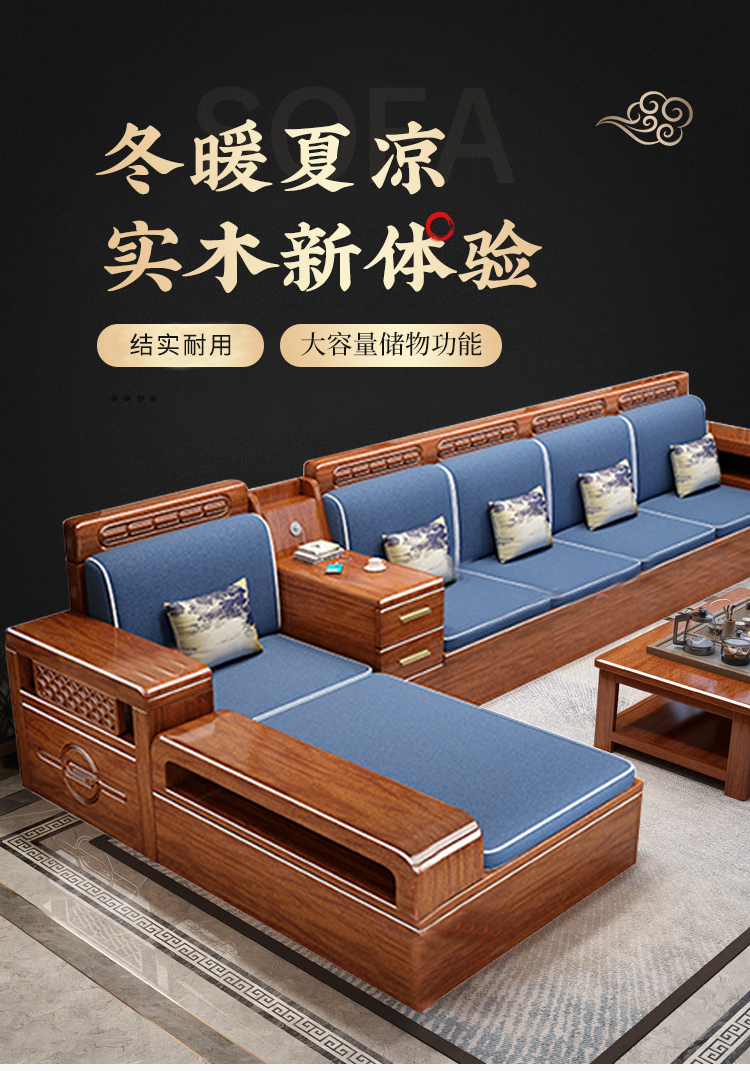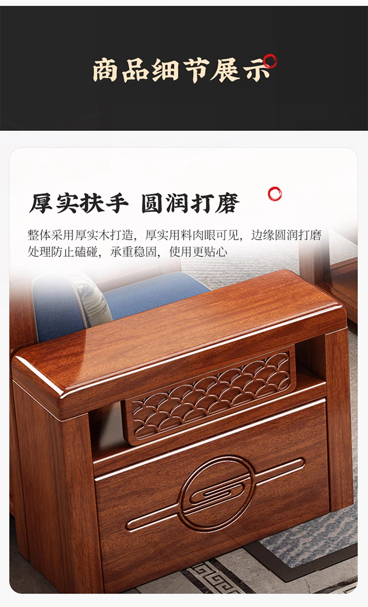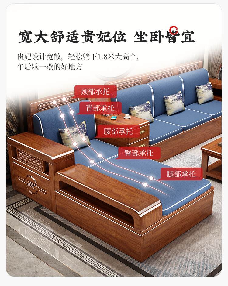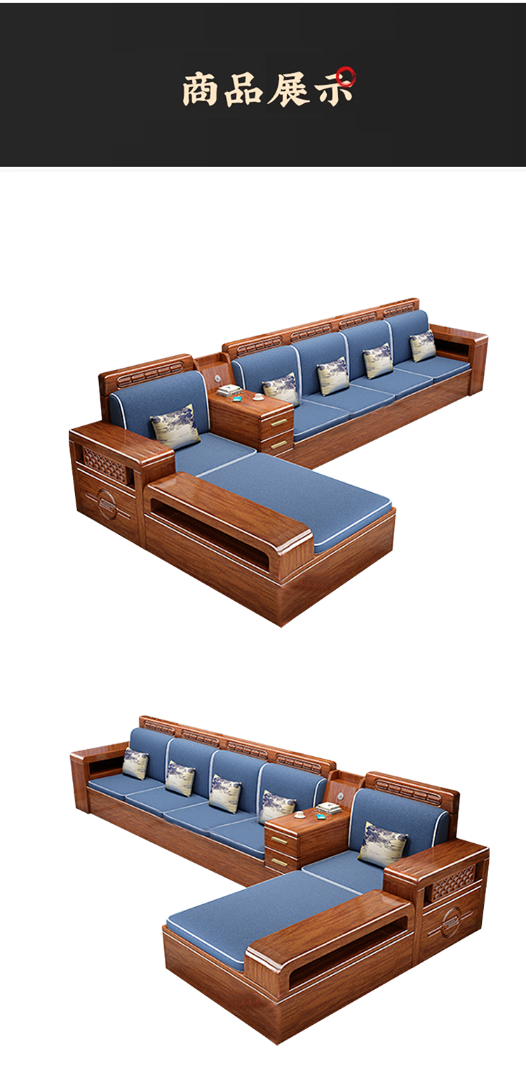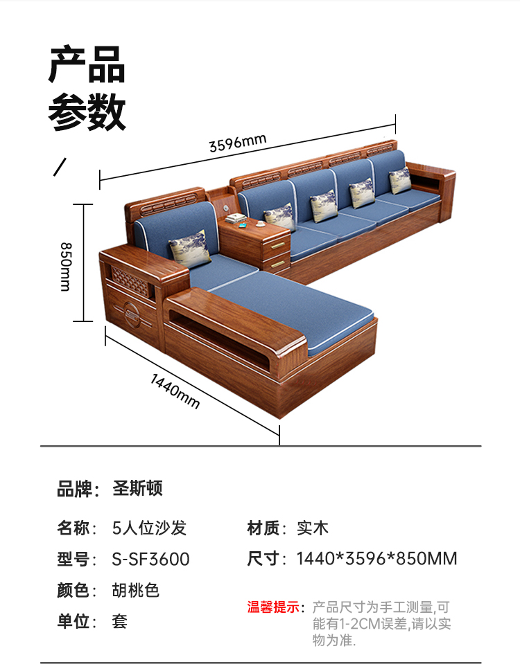 商品标题:圣斯顿S-SF3600实木组合沙发5人位+贵妃位+中箱+茶几1440*3596*850mm(单位:套)胡桃色
