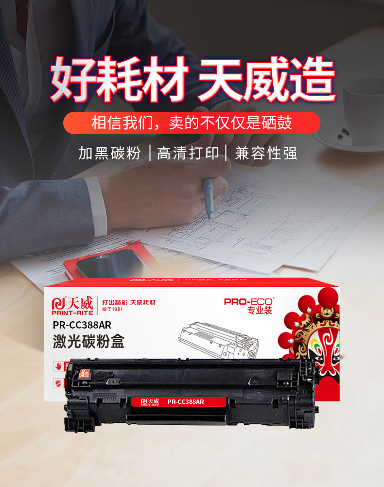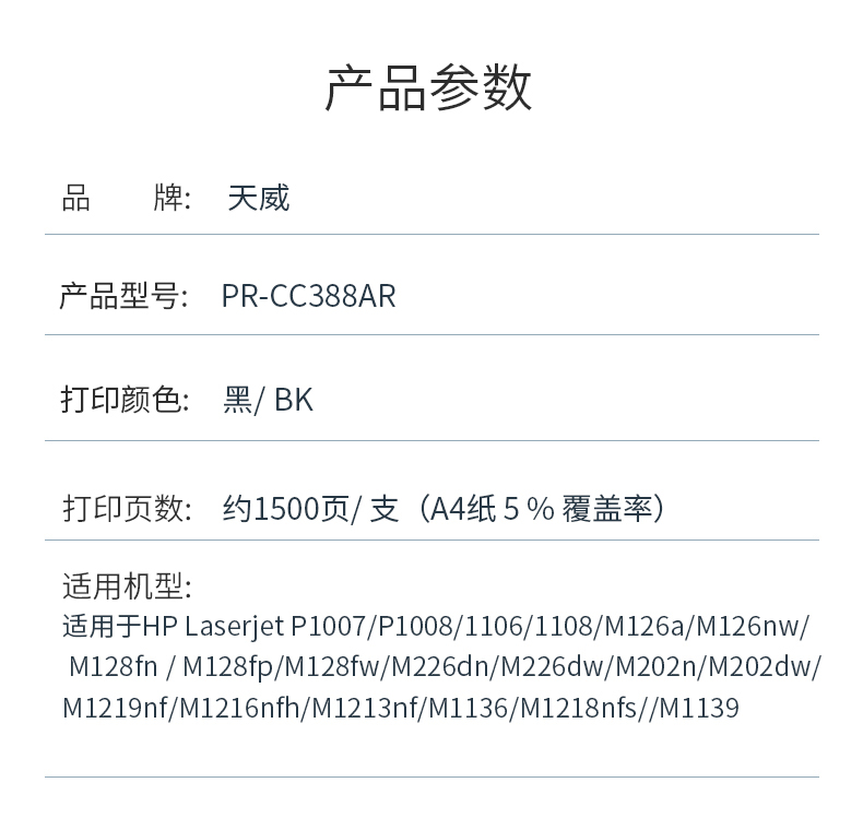天威兼容PR-CC388AR硒鼓(鼓粉一体)黑色单个装带芯片专业装(适用HP P1007/P1008/1106/1108/M126a/M126nw)打印页数:1500(单位:个)