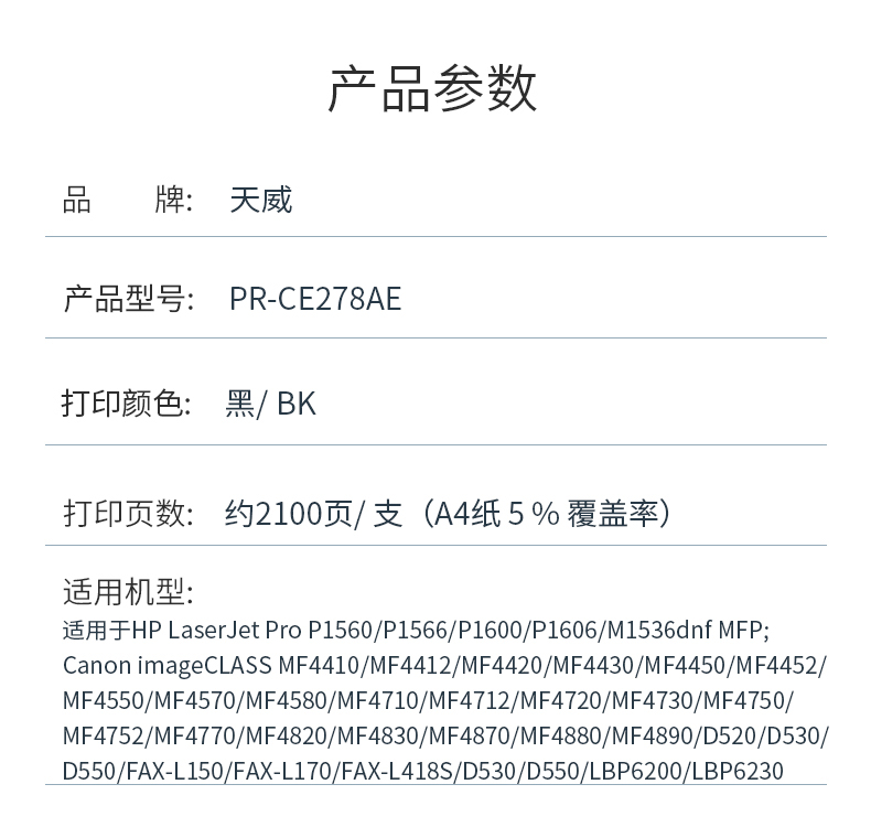 商品标题:天威兼容PR-CE278AE 硒鼓(鼓粉一体)黑色单支装带芯片商用装(适用于HP LaserJet Pro P1560;Canon imageCLASS MF4410)打印页数:2100(单位:支)