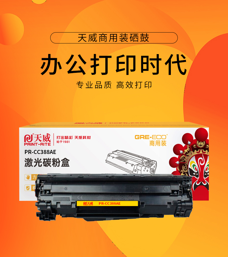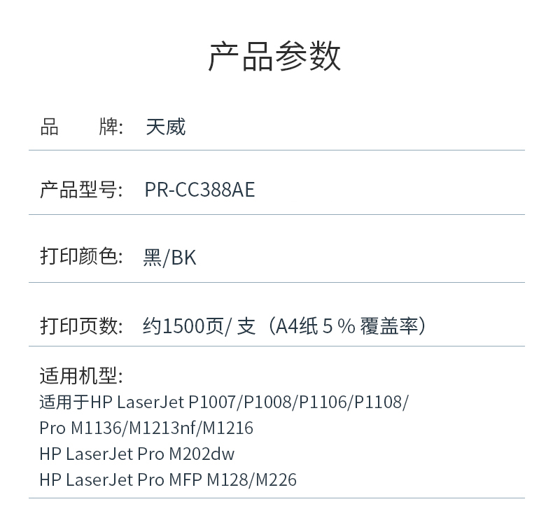 商品标题:天威兼容PR-CC388AE 硒鼓(鼓粉一体)黑色单支装带芯片商用装(适用HP P1007/P1008/P1106)打印页数:1500(单位:支)