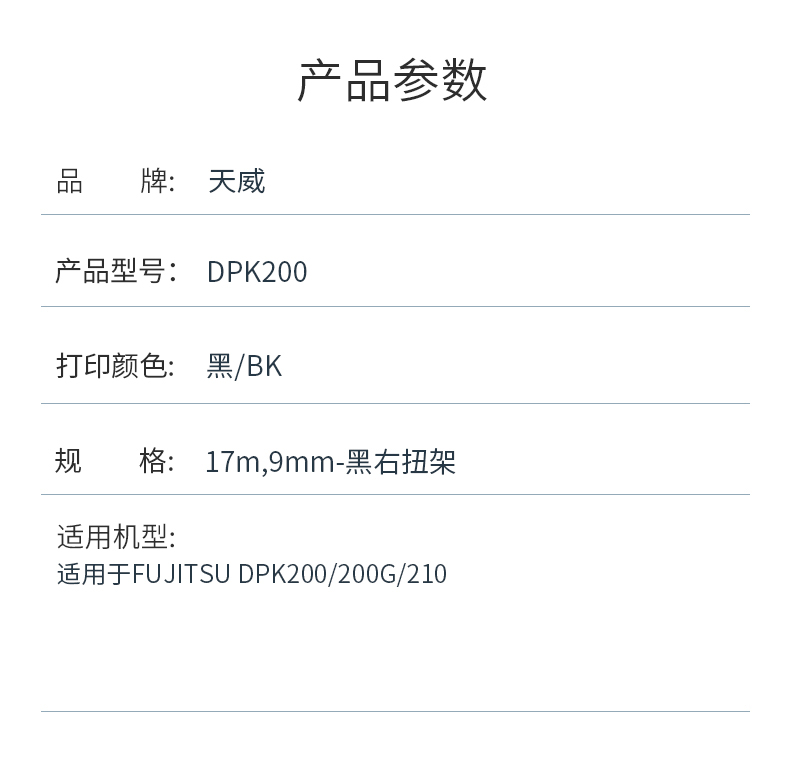商品标题:天威兼容DPK200/210色带(色带架含芯)黑色单支装(适用于FUJITSU DPK200/200G/210)色带芯:17m*9mm(单位:支)