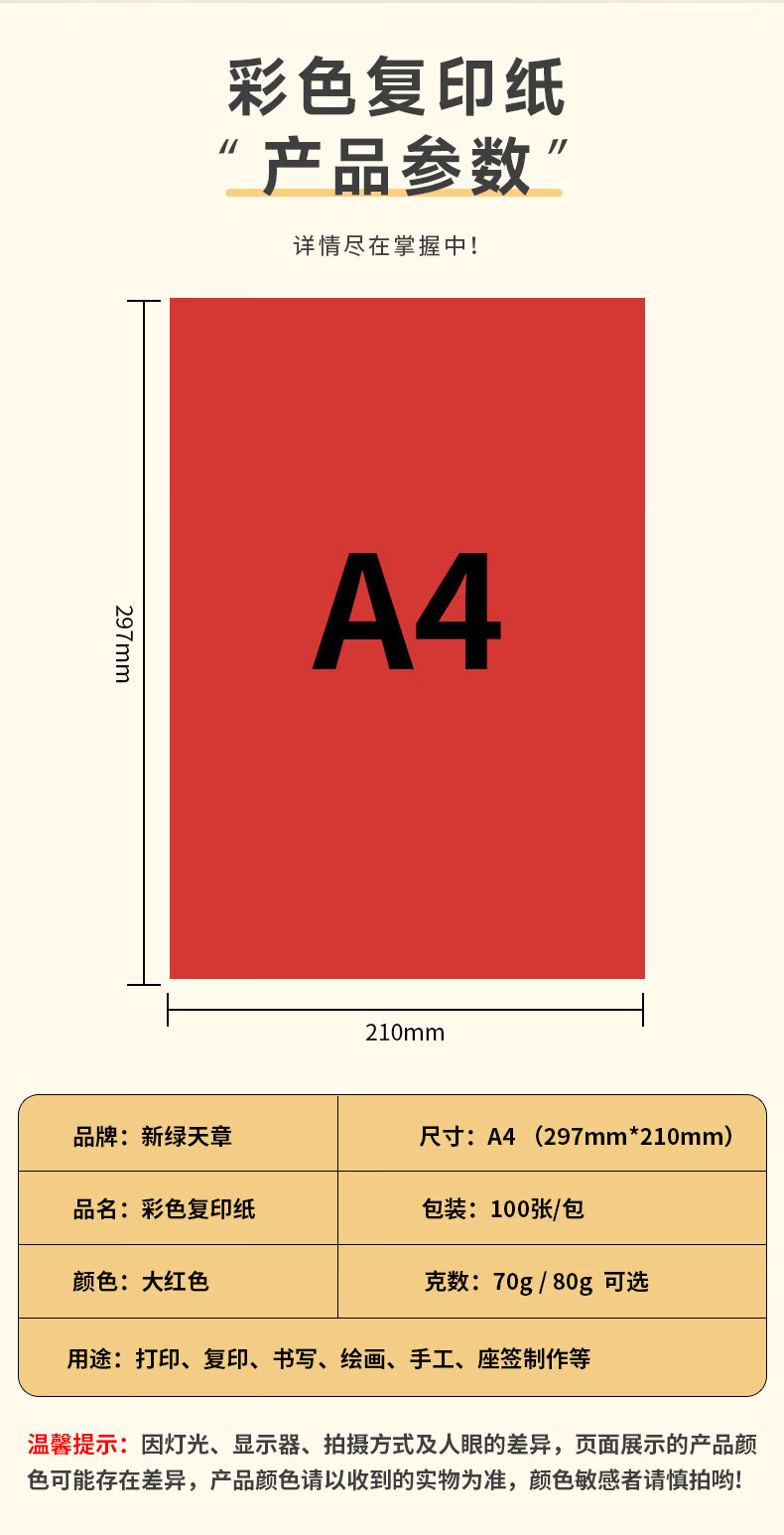 新绿天章P65392 彩色复印纸 A4 70G 大红 100页/包(单位:包)