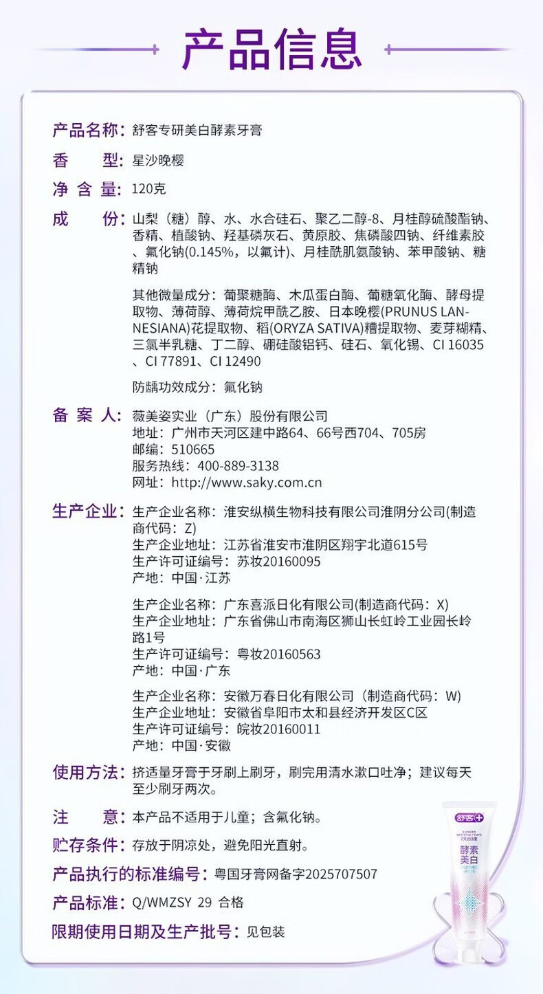 商品标题:舒客120g酵素美白牙膏星沙晚樱(单位:支)