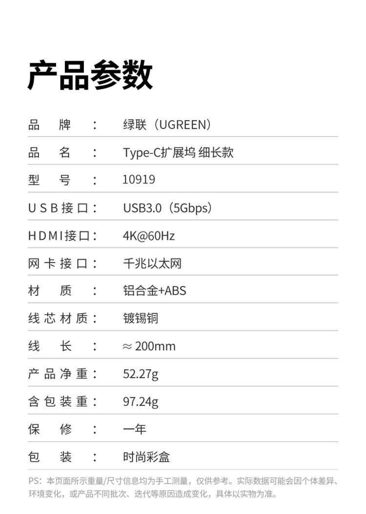 商品标题:绿联10919Type-C扩展坞 USB-C转HDMI分线器(个)