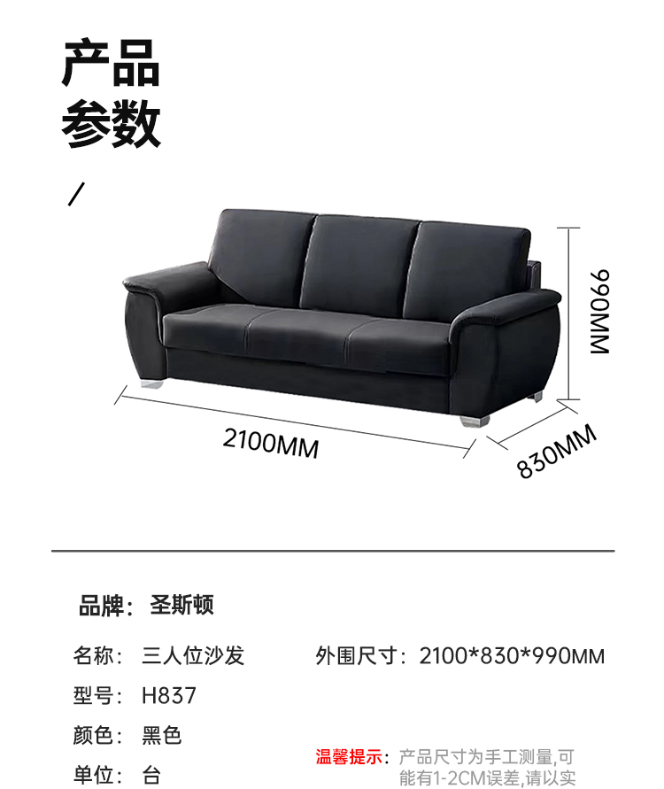 商品标题:圣斯顿H837-3牛皮三人位沙发2100*830*990mm(单位:张)黑色
