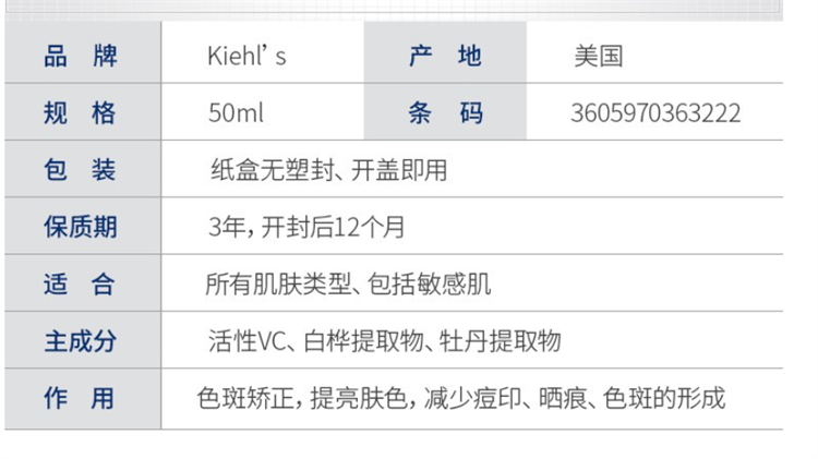 商品标题:科颜氏(Kiehl's)新集焕白均衡亮肤淡斑精华液 50ml(瓶)