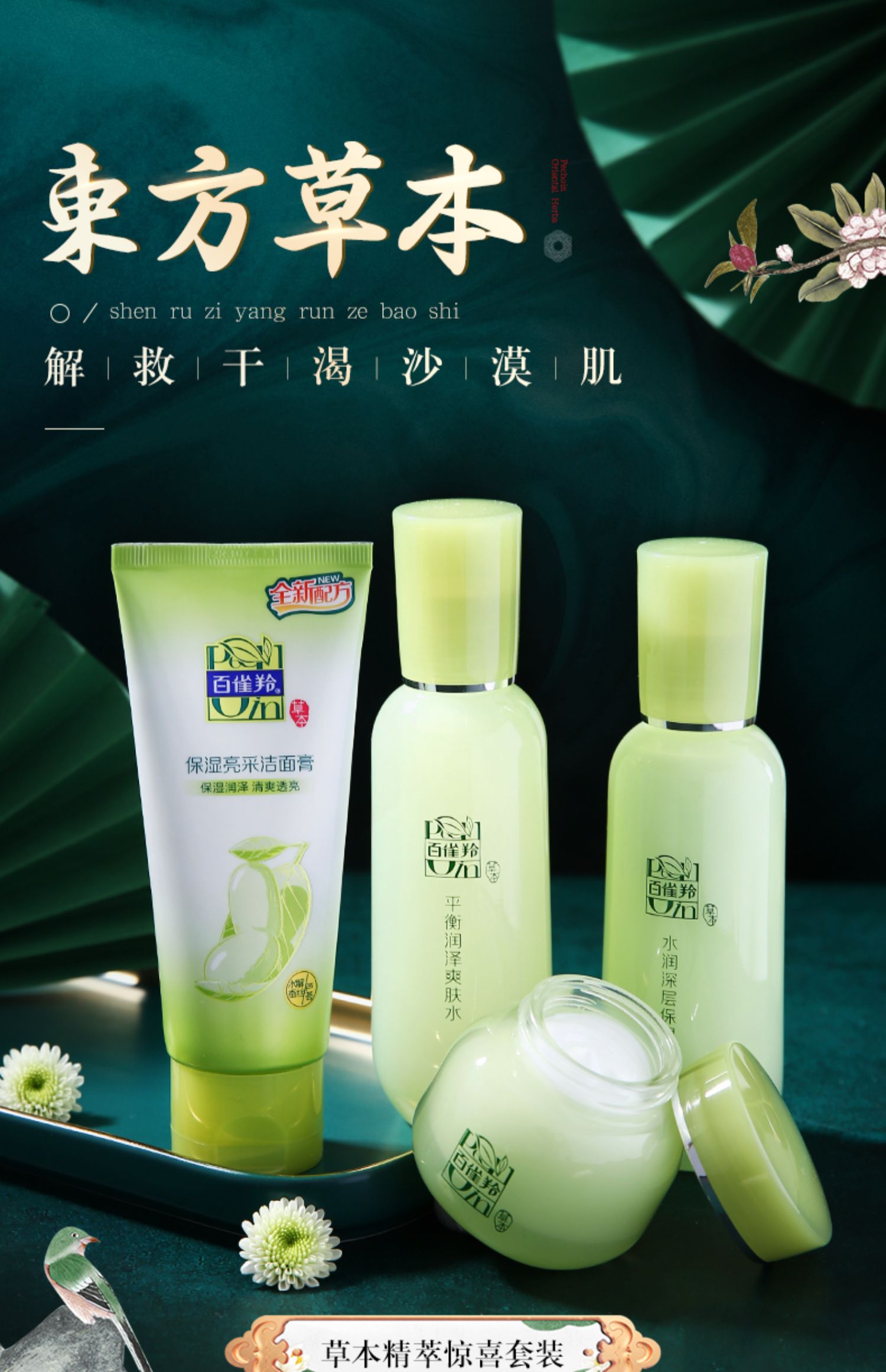 商品标题:百雀羚草本精萃惊喜礼盒(洁面膏95g+爽肤水100ml+保湿乳100g+精华霜50g)(盒)