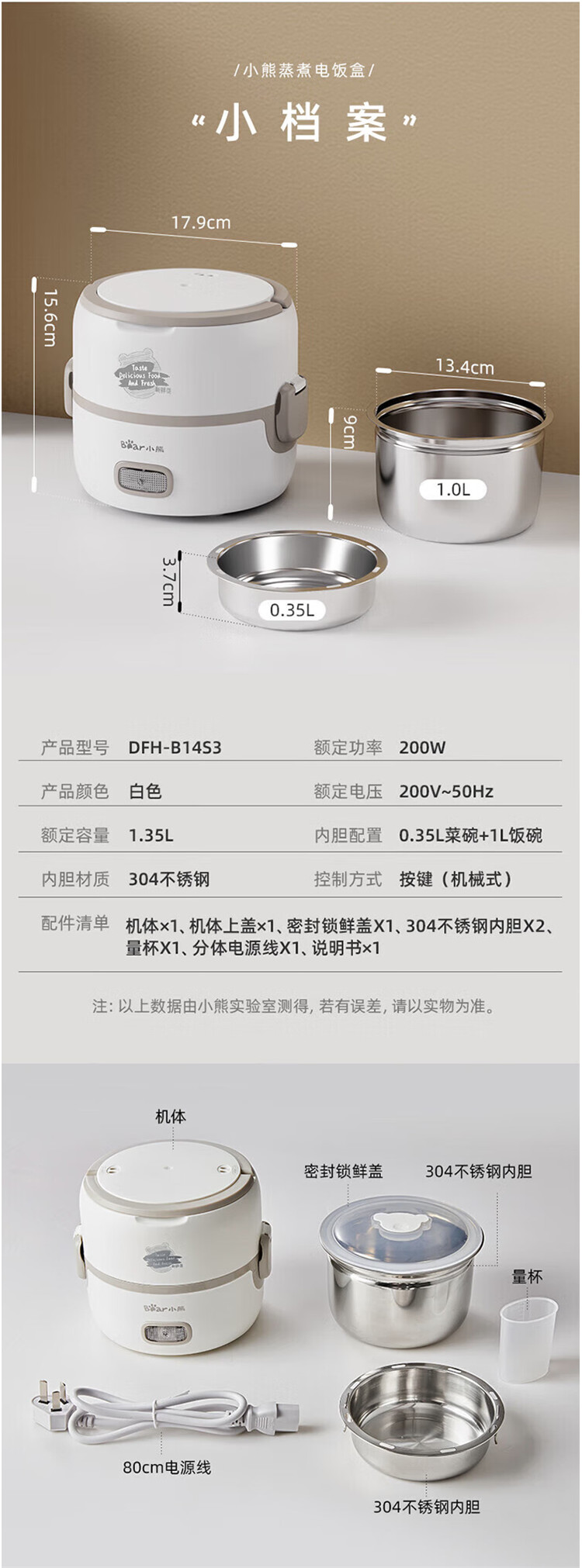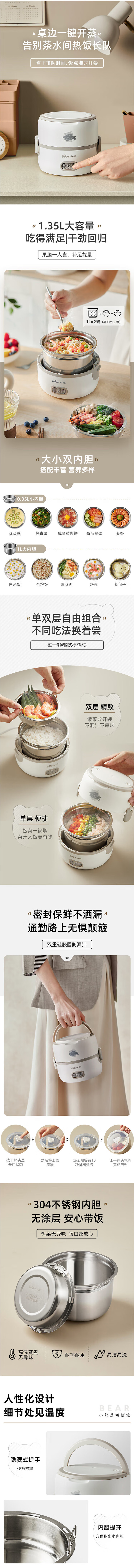 商品标题:小熊(Bear) DFH-B14S3电热饭盒不锈钢内胆1.2L (台)
