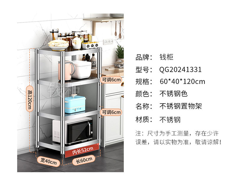 商品标题:钱柜QG20241331不锈钢四层置物架可调节60*40*120cm(张)