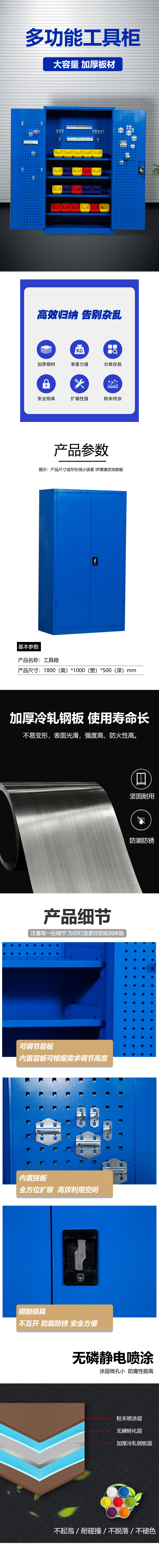 商品标题:齐初QC-DGJG-01重型五金工具柜多功能零件柜四层板+门挂板+背挂板蓝色不含配件180*100*50cm(台)