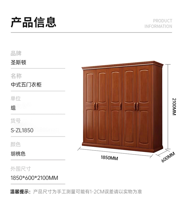 商品标题:圣斯顿S-ZL1850中式五门衣柜1850*600*2100mm(单位:组)胡桃色