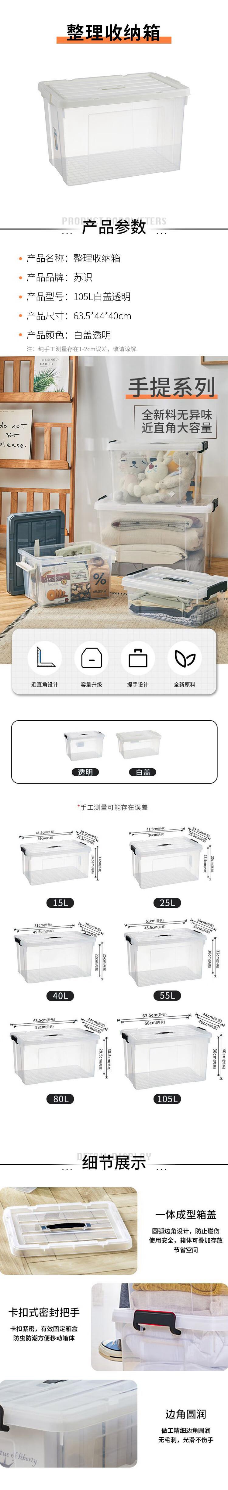 商品标题:苏识 105L 白盖透明 防水防潮透明整理收纳箱 (计价单位:个) 白盖透明